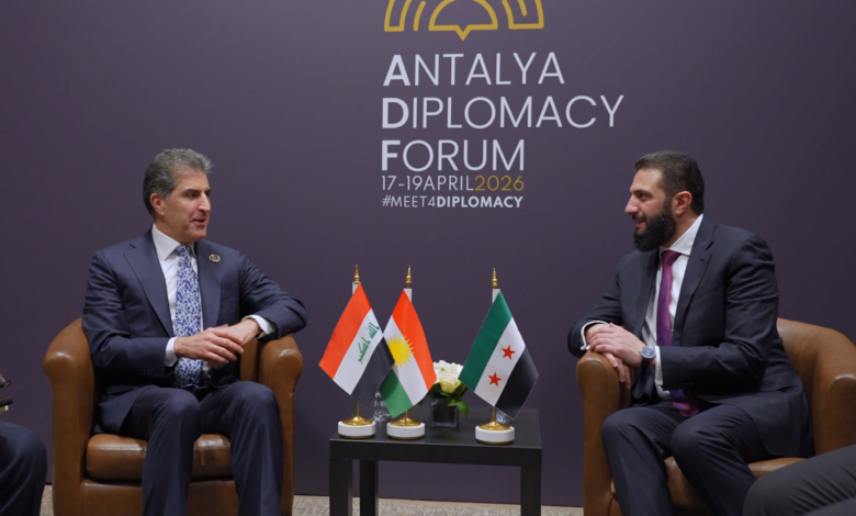 عقد رئيس إقليم كوردستان نيجيرفان بارزاني، اليوم الجمعة، اجتماعاً مع الرئيس السوري أحمد الشرع على هامش أعمال منتدى أنطاليا الدبلوماسي.
